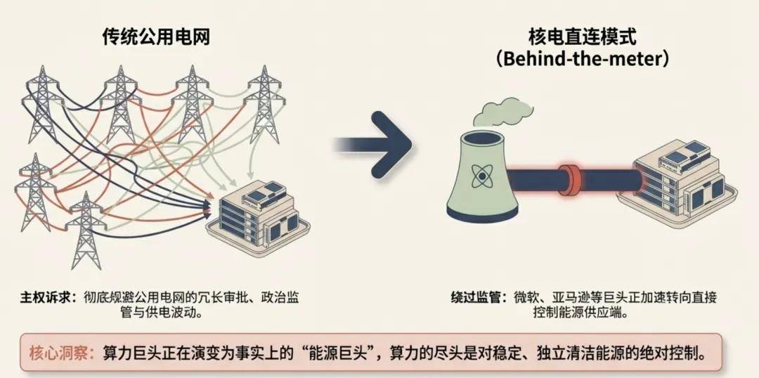 甲骨文在德州依赖天然气调峰的模式在阿比林遭遇了挫折,这反而推高了市场对“核电+数据中心”直连模式的需求。亚马逊 AWS 斥资 200 亿美元与 Talen Energy 达成的 1.9 GW 核电协议,以及微软重启三哩岛核电站的计划,预示着顶级 AI 厂商正在寻求跳过公用电网,通过独占核电等基荷电源来确保算力供应的连续性 。