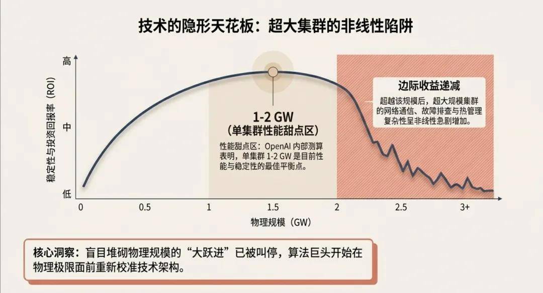 第三,OpenAI需求的频繁变化也让项目扩建陷入停滞。OpenAI对于AI算力集群设计在不断挑战,根据OpenAI基础设施管理层Sachin Katti , 1-2 GW 的单站点数据中心规模是目前网络互连与训练稳定性的“甜点区”(Sweet Spot) 。超过 2 GW 的单集群在散热管理、断电恢复以及跨机架同步(Syncing)方面会产生非线性的复杂度 。