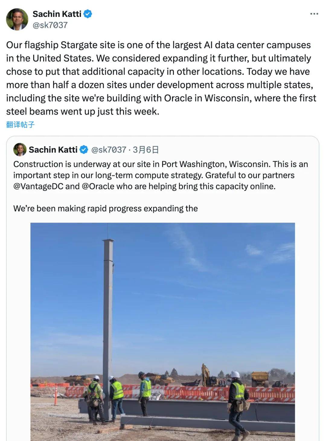 OpenAI 基础设施高管 Sachin Katti 在社交媒体上写道:“Stargate的旗舰项目是美国最大的 AI 数据中心园区之一。我们曾考虑进一步扩展,但最终选择将额外容量转移到其他地点。”