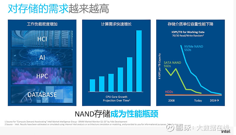 从工作负载密度来看,包括HCI超融合、AI、高性能计算以及数据库等场景,工作负载密度都是在增加的,用户对于计算的需求也是在快速增长,遗憾的是,在技术不断演进的过程中,NAND存储单位容量的性能在不可避免地越来越低,这与不断增加的工作负载完全相反,于是,在系统中,NAND SSD往往会成为性能瓶颈。