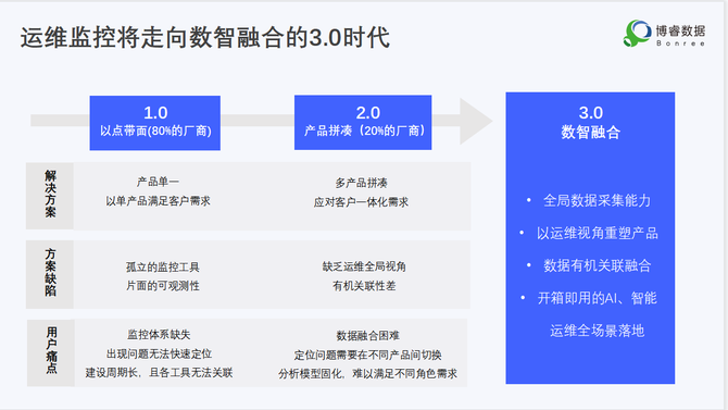 另一方面,从行业角度而言,运维监控正在从以点带面的1.0时代向数智融合的3.0时代发展。数智融合3.0时代需要运维企业具备全局数据采集能力、以运维视角重塑产品、数据有机关联融合、开箱即用的AI以及运维全场景的落地等一系列运维能力。