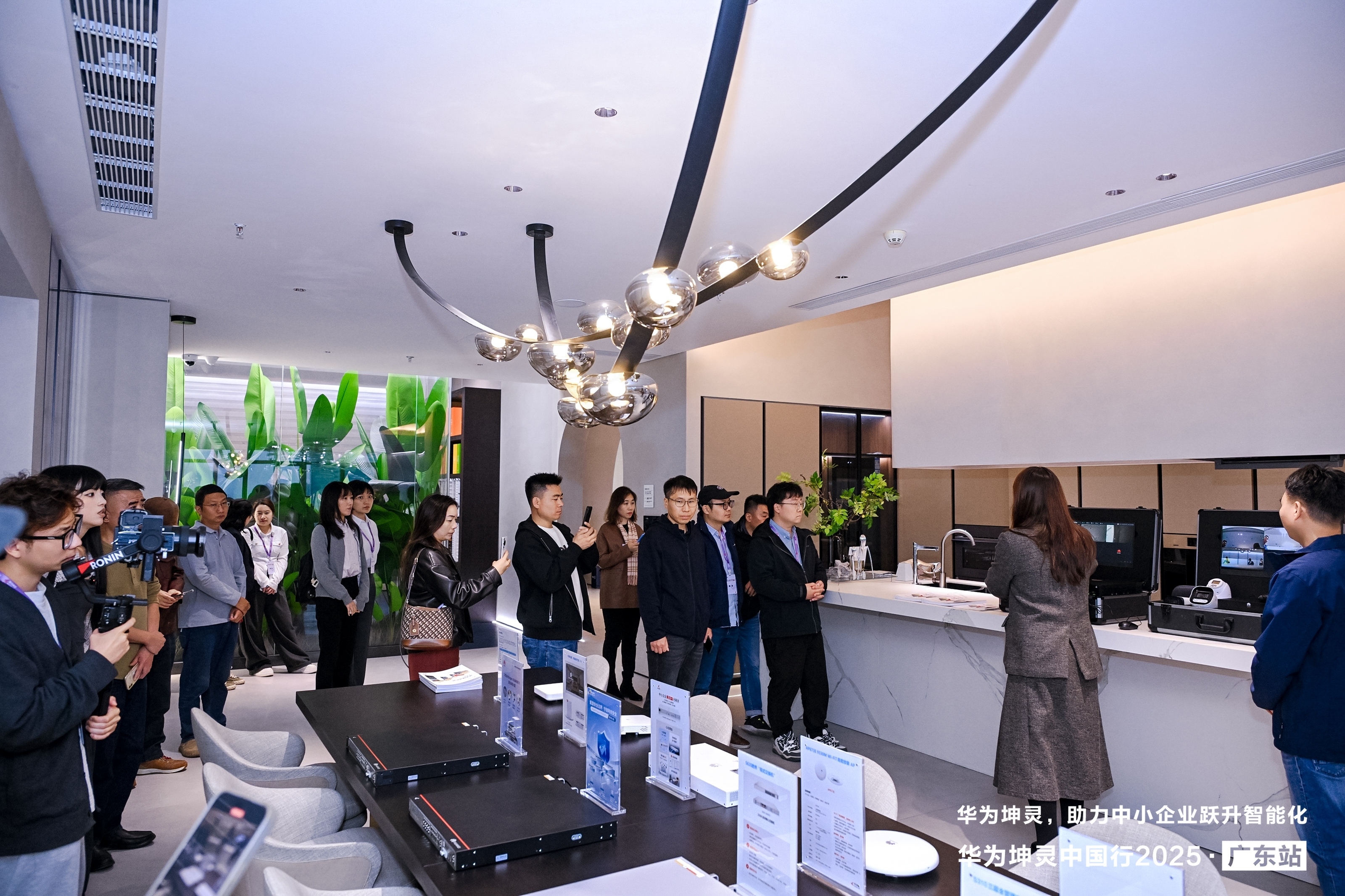 在本次活动期间,嘉宾参观了华为坤灵样板点——广东华海智家科技有限公司,该样板点全面展现了智能商业、智能办公等场景业务方案。参观嘉宾纷纷表示,通过实地体验,深切感受到华为坤灵产品紧贴需求的高品质与高效能,为中小企业智能化升级提供了可行路径,期待后续能深入合作。