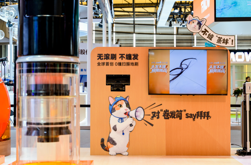 走进友望展台,相比于冷冰冰的参数墙,展区内代之以“家场景”“细节博物馆”等匠心设计,展示真实用户的清洁痛点留言;除螨仪区域配备尘螨显微镜观察装置,让观众亲眼看到微观世界;吸尘器区设置了“0缠发挑战”,邀请观众测试超长头发是否会缠绕。